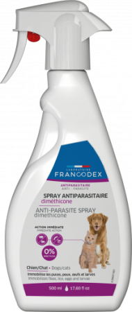 Sans rinçage, le SPRAY ANTIPARASITAIRE AU DIMÉTHICONE FRANCODEX possède une action mécanique immédiate sur les parasites externes : le diméthicone agit comme un piège qui englue les parasites. Ceux-ci ne peuvent plus bouger. Son action purement mécanique, sans pesticide ni insecticide chimique, en fait un produit utilisable chez les femelles gestantes ou allaitantes. L’Aloe vera a un effet hydratant et apaisant pour le pelage.