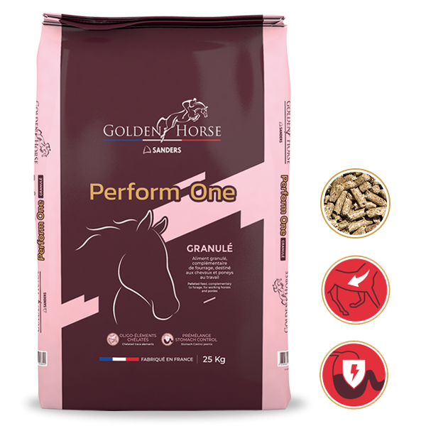 Développées par les experts nutritionnistes Sanders, qui s’appuient sur plus de 100 ans de savoir-faire, les gammes d’aliments Golden Horse couvrent l’ensemble des besoins des chevaux, quels que soient leur activité et leur stade physiologique. Elles allient sécurité et équilibre tout en étant simples d’utilisation. Les aliments de la gamme Perform associent des oligo-éléments sous forme chélatée pour une meilleure assimilation au pré-mélange Stomach Control, qui contribue à réduire le risque d’apparition de troubles stomacaux. L’ensemble de la formule (pré-mélange, bicarbonate de sodium et autres matières premières) assure un pouvoir tampon idéal, indispensable à la maîtrise du pH. Ce pré-mélange contribue à renforcer la muqueuse de l’estomac (sépiolite et lécithine) et participe à apporter l’élément constitutif de la paroi du tube digestif (thréonine).