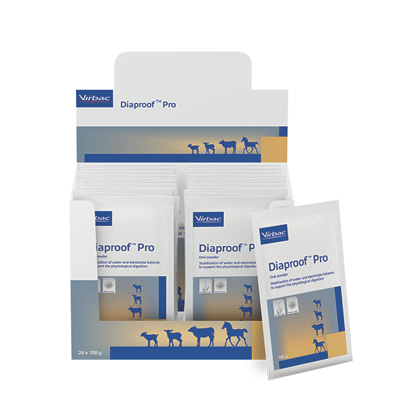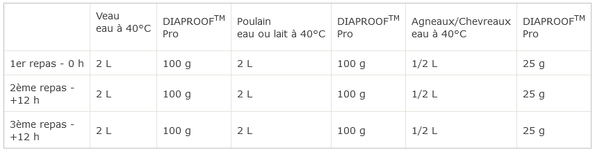 L'alimentation lactée devrait être continuée séparément. Sinon, une reprise progressive de l'alimentation lactée - moitié lait, moitié eau - est donnée après l'utilisation de DIAPROOF Pro. Pour les races de petit format, la buvée peut être réduite : la mesure de DIAPROOF Pro est à ajuster avec le volume d'eau.